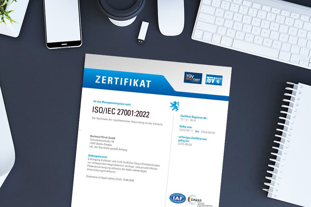 Unsere Kunden und wir sehen die Qualität medizinischer Leistungen als oberste Maxime. Das bedeutet auch für uns, ein konsequentes internes Qualitätsmanagement zu betreiben und bei der steten Verbesserung digitaler Prozesse mitzuwirken. Die Ergebnisse werden von unabhängigen Stellen, TÜV, DAkkS und BSI, geprüft. Als Bestandteil der kritischen Infrastrukturen hat sich die MEDIT Service GmbH im Rahmen der Erfüllung aller Anforderungen an die ISO27001 bereits im Juni 2022 erfolgreich einer Zertifizierung gestellt.